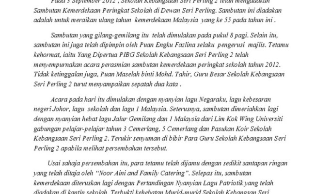 Di sini admin ingin berkongsi Himpunan Kertas Kerja Sambutan Bulan Kemerdekaan hasil daripada perkongsian dari rakan guru bagi sambutan bulan kemerdekaan yang tiba tidak lama lagi. Majlis Sambutan Hari Kemerdekaan diadakan untuk memperingati Hari Kemerdekaan Negara dan memberi kesedaran kepada murid-murid erti kemerdekaan disamping mengetahui. Contoh Laporan Evaluasi Kegiatan Contoh Laporan Evaluasi Kegiatan Evaluasi Kegiatan Wisuda Angkatan ke-1 SMK.